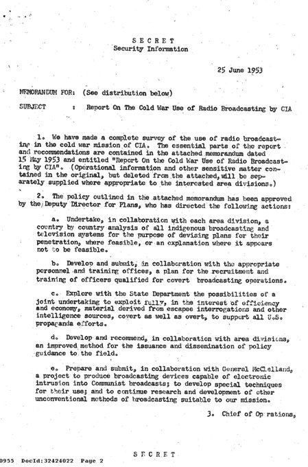 Some juicy pages from the JFK files Califano Papers outlining the CIA using “political and psychological warfare” to spread their influence during the Cold War. These files outline the CIA plan to “penetrate” all radio and television in every country of interest, to combat the influence of the USSR and China.
