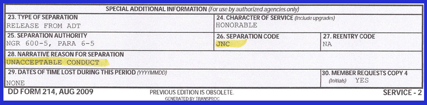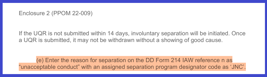 Interestingly, for all Army National Guard (ARNG) soldiers on Title 10 active duty who refused the vax, Gary discovered there was guidance that directed the chain of command to use “the JNC code” on a service member’s DD-214. The JNC code is military separation code represents an involuntary discharge for unacceptable conduct.