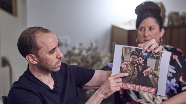 [image: Tal Shoham sitting next to his wife, Adi, as he holds up a poster of his two friends, Evyatar David and Guy Gilboa-Dalal, who are still hostages in Gaza. ]