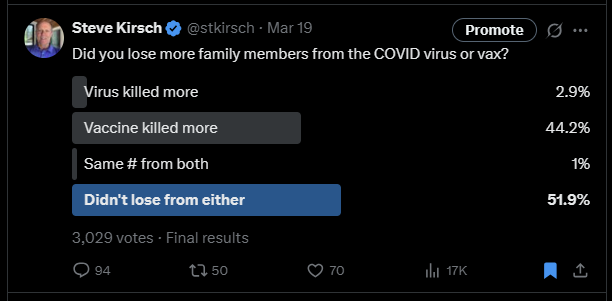 *Is the survey biased? My readers are aware that the COVID vaccine might kill people. They took the red pill. That’s why the survey is so lopsided.*