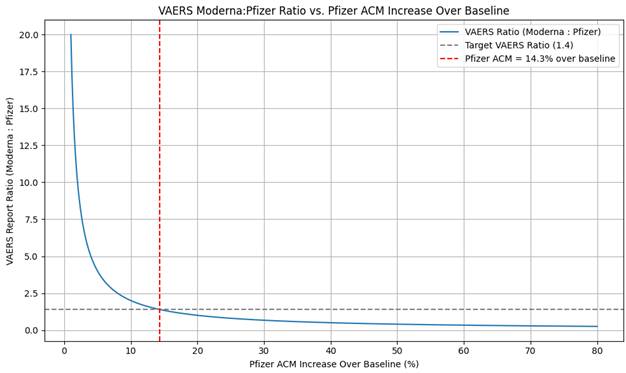 If we use that as a fixed value (a 20% increase over baseline), then we simply use the differential brand mortality reporting ratio in VAERS for death events per dose and we can use the chart above (source code <github.com/skirsch/python/blob/876fcf660d876d801d7af9dd9dff06b9804517b7/VAERS_pfizer_ACM.py>) to get the number which is 14.3%.