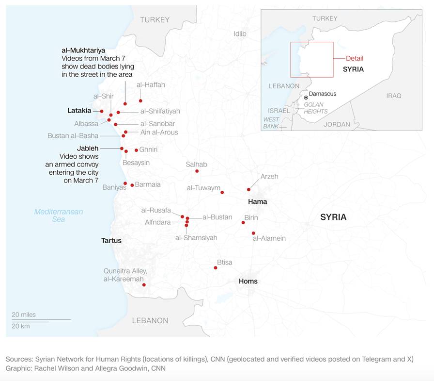 *Even CNN had to report on the massacres <edition.cnn.com/2025/03/17/middleeast/syria-massacre-alawite-minority-intl-invs/index.html>, analyzing interviews with survivors, satellite imagery, and verified footage from the ground to “shed light on the scale of the carnage” in the town of Sanobar, “where government-aligned forces subjected largely unarmed villagers to summary executions, looting, arson, and sectarian slurs, and bodies were piled up in two mass graves.”*