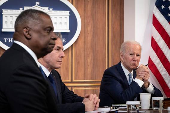 [image: President Joe Biden sits alongside Defense Secretary Lloyd Austin and Secretary of State Antony Blinken during a video call with Indian Prime Minister Narendra Modi on April 11, 2022.]