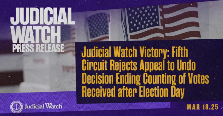 “This Fifth Circuit action is a historic victory for honest elections and now. Federal law sets ‘Election Day’ not ‘Election Week,’” said Judicial Watch President Tom Fitton. “California and the 17 other states should take notice. Our lawsuit just filed against California for counting ballots received for up to seven days after Election Day has even more urgency and strength.”