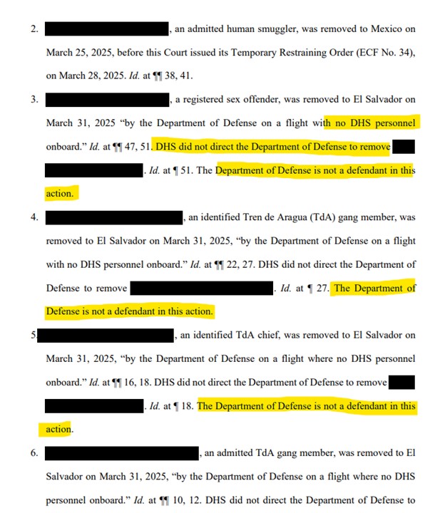 It also includes a sworn declaration from a DHS official, who stated that every person deported after Murphy’s court order was sent to Guantanamo Bay before being shipped off to El Salvador on military flights.
