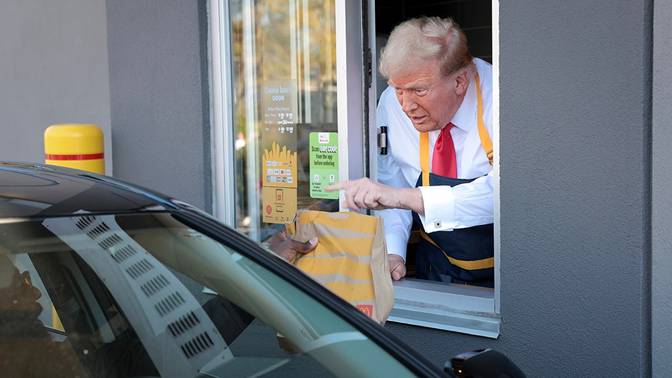 [image: Republican presidential nominee and former President Donald Trump works the drive-through line during a campaign photo op as he visits a McDonald’s restaurant]