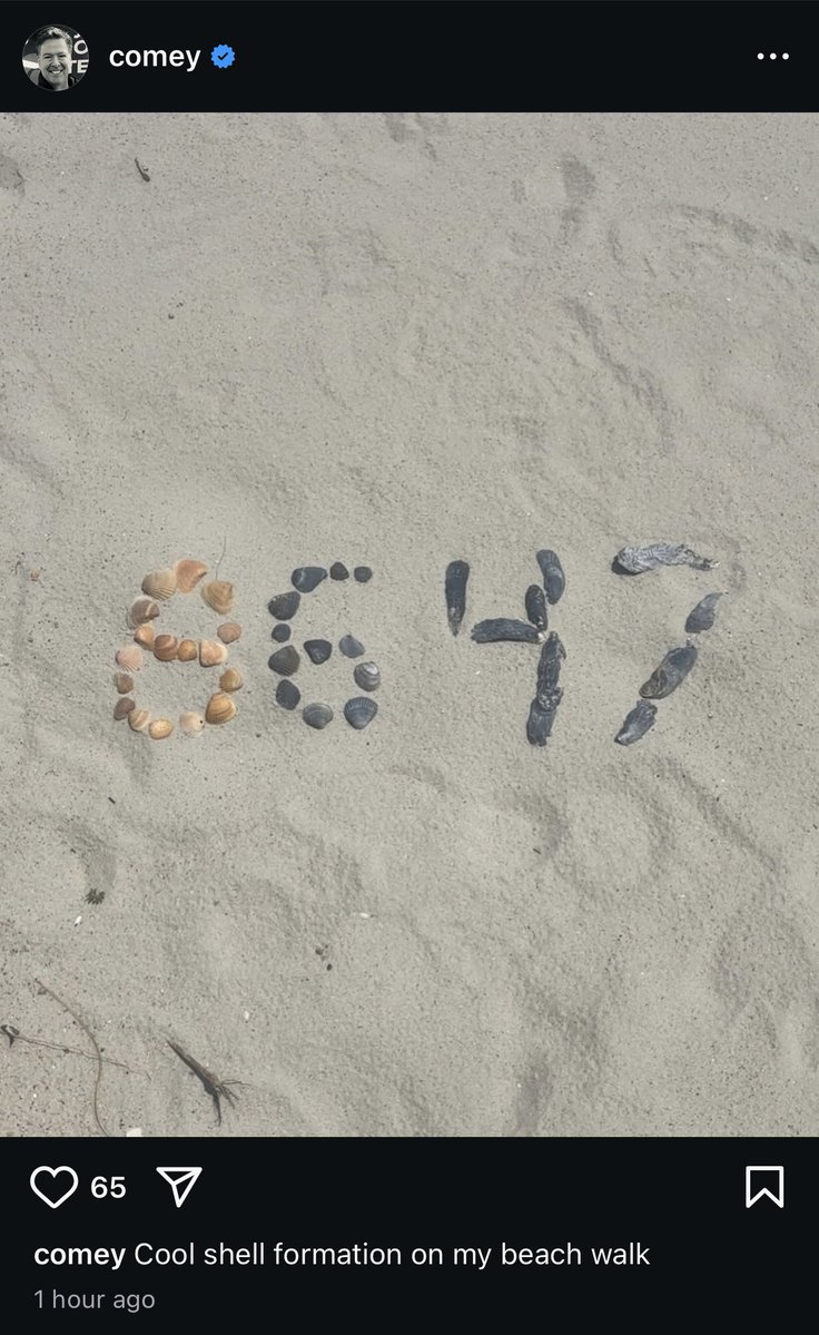 James Comey posted a cryptic message to his Instagram account on Thursday spelled out in seashells: “86 47”