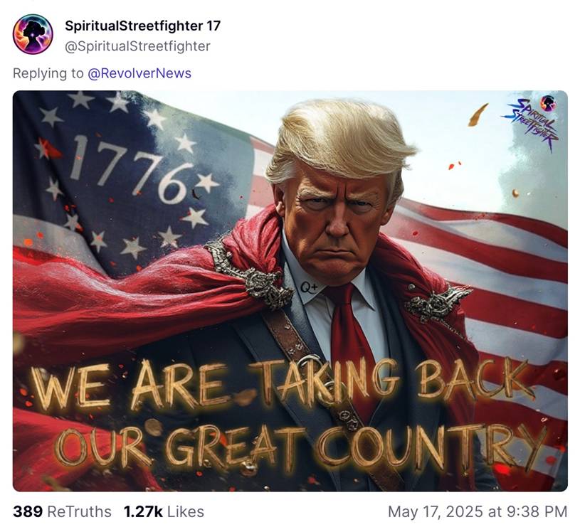The image <truthsocial.com/@SpiritualStreetfighter/posts/114526512267835006> was captioned: “ALL ROADS LEAD TO OBAMA… RETRUTH IF YOU WANT PUBLIC MILITARY TRIBUNALS.”