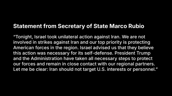 [image: Statement from Secretary of State Marco Rubio “Tonight, Israel took unilateral action against Iran. We are not involved in strikes against Iran and our top priority is protecting American forces in the region. Israel advised us that they believe this action was necessary for its self-defense. President Trump and the Administration have taken all necessary steps to protect our forces and remain in close contact with our regional partners. Let me be clear: Iran should not target U.S. interests or personnel.”]