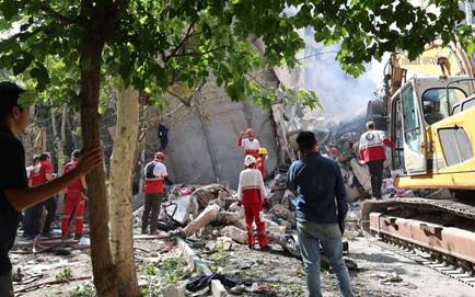 Iranian Red Crescent volunteers gathered in front of a building destroyed in an Israeli strike in Tehran, June 14, 2025. (Iranian Red Crescent / AFP)