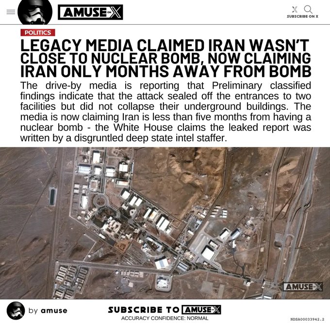 [image: The drive-by media is reporting that Preliminary classified findings indicate that the attack sealed off the entrances to two facilities but did not collapse their underground buildings. The media is now claiming Iran is less than five months from having a nuclear bomb – the White House claims the leaked report was written by a disgruntled deep state intel staffer.]