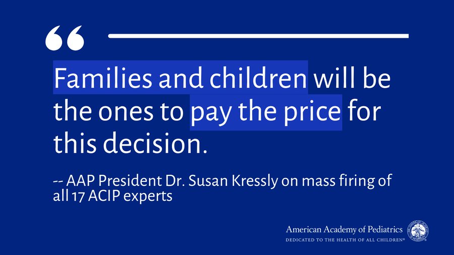 There is nothing independent about the members of ACIP – hasn’t been for decades. Say the truth: as a trade association representing pediatricians, AAP is worried that the evidence regarding vaccine products will be exposed and will harm the financial interests of AAP’s members. AAP’s conflict has not only endangered children for decades, but has also literally harmed countless children from vaccine injuries that Secretary Kennedy hopes to prevent. Unlike the AAP, which only supports activities that make its members money, the Secretary wants to save all children. So, step aside and let someone who cares about saving all children do his job.