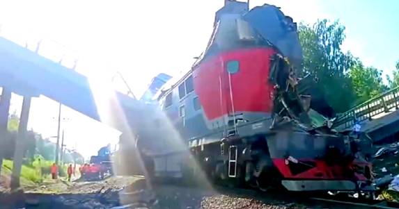 *“A passenger train traveling from Klimovo, Bryansk region, to Moscow was passing under a bridge on the A-240 federal highway when a span of the bridge collapsed directly onto the train. The impact damaged the locomotive and several railcars, causing a derailment.*