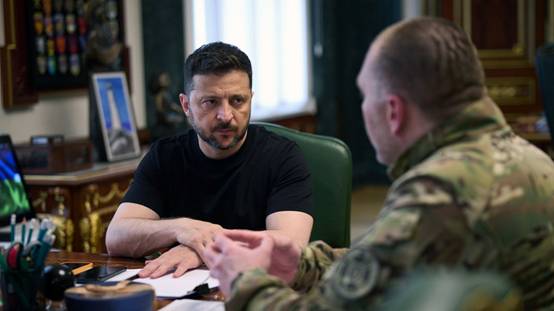 [image: Ukrainian President Volodymyr Zelenskyy listens during a meeting with a senior military officer]