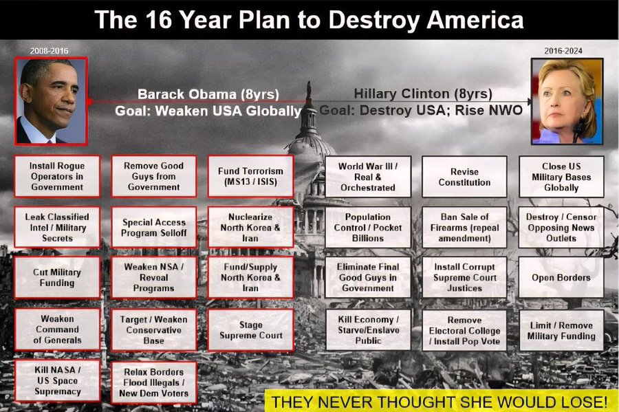 (21) Pastor Bob Joyce on X: “💥For those who think Trump trolling Obama with posts of arrest is harsh, see the graphic below. Read and understand what they had planned for us. The 16 Year Plan to Destroy America… https://t.co/v7bdX4OryO” / X