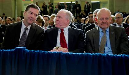 [image: From left: FBI Director James B. Comey, CIA Director John O. Brennan, and Director of National Intelligence James R. Clapper sit together in the front row before President Barack Obama spoke about National Security Agency (NSA) surveillance in this Friday, Jan. 17, 2014, file photo at the Justice Department in Washington. (AP Photo/Carolyn Kaster) ** FILE **]