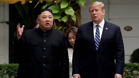 [image: President Donald Trump and North Korean leader Kim Jong Un take a walk after their first meeting at the Sofitel Legend Metropole Hanoi hotel, in Hanoi.]