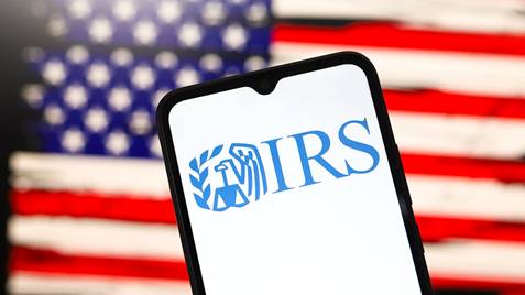 [image: IRS logo on phone screen with US flag on computer screen in background]
