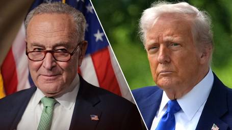[image: Sen. Chuck Schumer looks on with an American flag in background and President Donald Trump wears a blue suit jacket in split image]