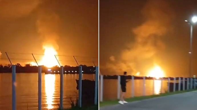 The drones reportedly struck oil and gas pipelines at the Orlivka plant in Odesa, Ukraine. Bright orange flames and plumes of smoke were visible across the Danube River.