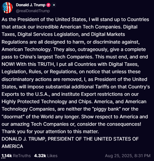 [image: https://www.thegatewaypundit.com/wp-content/uploads/2025/08/trump-post-online-digital-taxes.png]