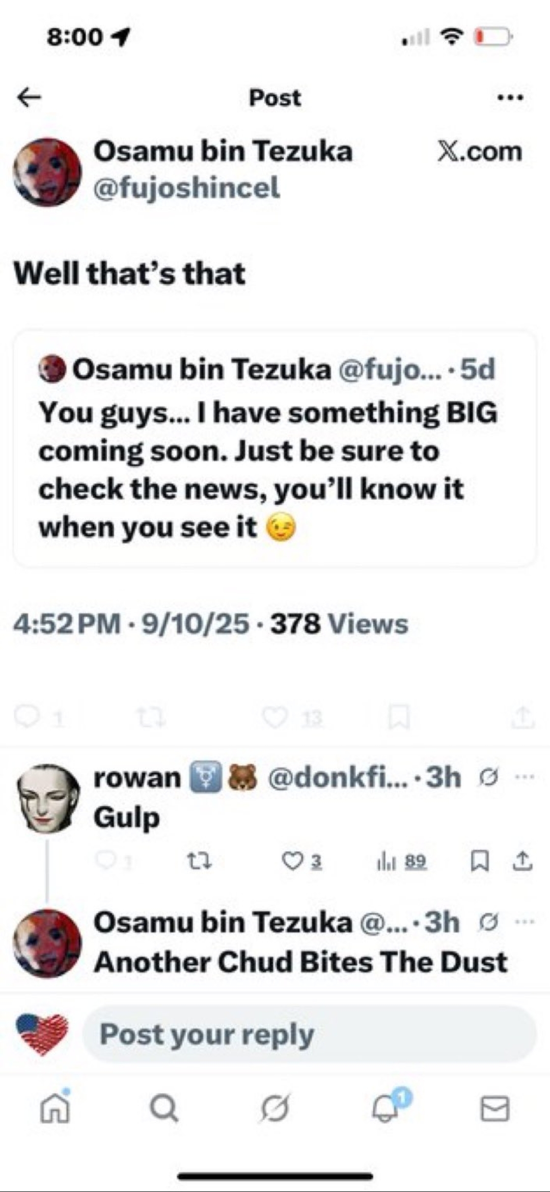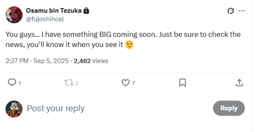 Another X account, with the handle “Fujoshincel,” posted on September 5 about “something BIG coming soon,” urging followers to check the news. Five days later, shortly after Kirk’s death was confirmed, they quoted the post and wrote, “Well that’s that,” and followed up by saying, “Another Chud Bites the Dust.”
