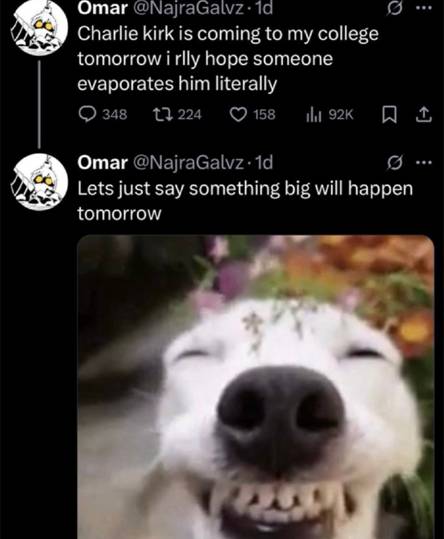 An account with the handle “NajraGalvz” posted on September 9, “Charlie Kirk is coming to my college tomorrow I rlly hope someone evaporates him literally.”