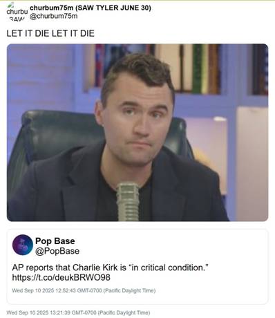 In a second post by the person followed by Twiggs, the user responded to the initial report from the Associated Press that Kirk was being treated at the hospital in critical condition with: “LET IT DIE. LET IT DIE.”