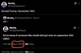 Another account appears to have posted about Kirk’s shooting on September 3, writing, “itd be funny if someone like charlie kirk got shot on september 10th.”