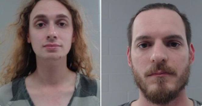 [image: Mugshots of two individuals, one with long curly hair and the other with a short beard, both wearing striped prison attire.]