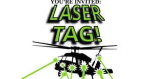 [image: Invitation graphic for a laser tag event featuring a helicopter and laser beams, designed to attract participants with fun visuals and bold text.]