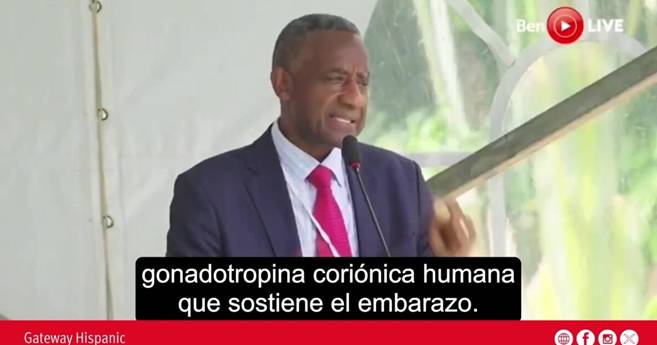 [image: A speaker discusses human chorionic gonadotropin and its role in supporting pregnancy during a public event.]