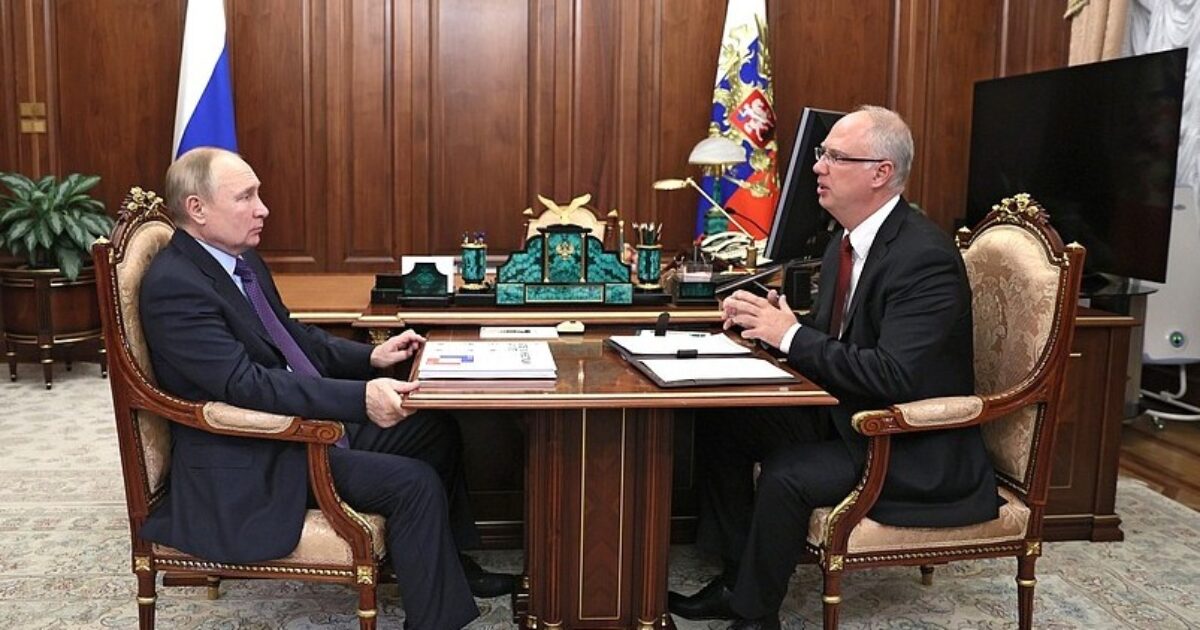 [image: Vladimir Putin and a government official engage in a discussion at a formal meeting in an office setting, surrounded by Russian symbols and decor.]