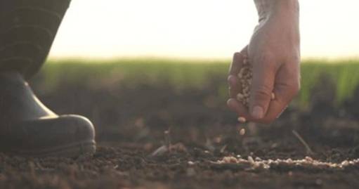 [image: Hand scattering seeds into rich soil in a field during sunrise, symbolizing agricultural practices and planting.]